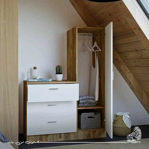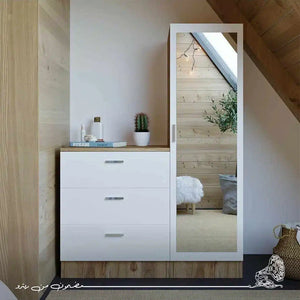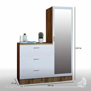 Designed to be more than just a decorative piece, this vanity is an organized space that combines beauty and functionality. Its white and wood finish creates a calming yet modern look, while the elegant mirror beautifully reflects light. It features three practical drawers for organizing your toiletries, along with an innovative side storage unit with a mirrored door, including a shelf and internal hanger, to suit your various daily needs.