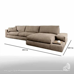 This modern 300cm corner sofa offers a spacious seating area, crafted from durable natural wood and high-quality velvet fabric with soft foam padding for optimal comfort and support. Its practical design allows for comfortable use by families or for entertaining guests, while maintaining the room's elegance and modernity. Combining functionality and beauty, this corner sofa becomes a centerpiece that adds warmth, sophistication, and distinctive style to the living room.Materials: