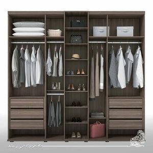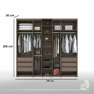 This modern dressing room, measuring 180 x 200 cm, is practical and spacious, allowing you to store your clothes neatly and efficiently. It features three hangers for easily hanging long and short garments, six drawers for tidying accessories and small items, and several shelves for folded clothes. Its elegant brown color adds warmth and charm to your room. Made from EU-manufactured MDF, this dressing room is highly durable and provides comfortable, long-lasting everyday use, making it an essential piece that adds a touch of practicality and luxury to any bedroom.Materials:
