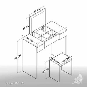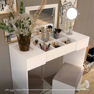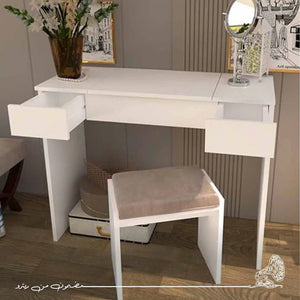 This modern dressing table boasts a smart and innovative design, measuring 92 cm wide. Crafted from high-quality MDF, it offers a practical and stylish solution for organizing your daily essentials. The tabletop opens to reveal a built-in mirror and an interior storage space, perfect for keeping cosmetics or accessories out of sight and maintaining a tidy appearance. It also features two external drawers for additional storage, making it versatile and practical for everyday use. Its pure white finish adds a touch of brightness and simplicity to any room's décor.Materials: