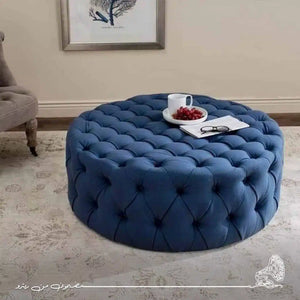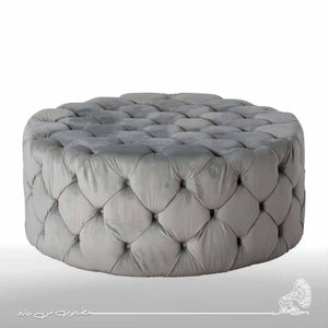 A stylish round tufted pouf that combines practicality and beauty, upholstered in soft gray fabric with tufted details that add a touch of luxury. Ideal for use as extra seating or a distinctive decorative piece in any room. Product available: upon request.
