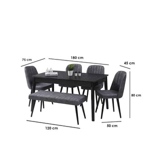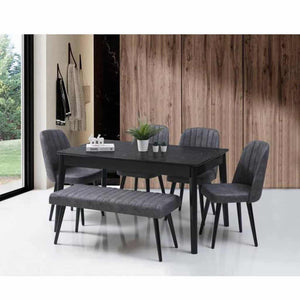A stylish, modern dining set that combines practicality with visual appeal. The set includes a spacious table and four comfortable chairs, thoughtfully designed for both everyday use and entertaining, along with a bench that adds practicality and flexibility to family gatherings. The table and chairs are crafted from premium red beech wood, known for its durability and strength, ensuring a long-lasting piece of furniture. The chairs are upholstered in elegant, breathable linen fabric that provides comfort with a touch of understated sophistication. The high-density foam cushions offer optimal support and comfort for extended periods of sitting. The set combines gray and black in a contemporary style that adds depth and elegance to the dining room, and the carefully considered dimensions of the table and chairs make it ideal for medium to large spaces. This dining set is more than just a place to eat; it's a space that brings family and friends together in an atmosphere of comfort, beauty, and refined taste.