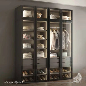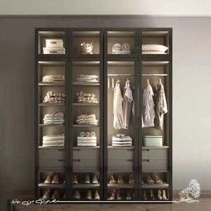 This modern dressing room, measuring 150 x 220 cm, boasts a contemporary design that combines practicality and elegance, providing ample space for organizing your clothes and personal belongings. It features four storage units, maximizing storage capacity. Two hangers allow for easy hanging of both long and short garments, while several shelves organize folded clothes or bags, and four drawers keep accessories and small items neatly stored. Its sophisticated black finish lends a touch of modern luxury to any room, creating a warm and stylish ambiance, making it a perfect addition to any modern bedroom.Materials: