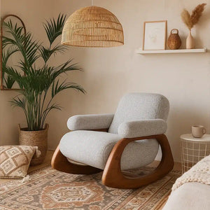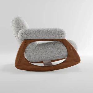Enjoy moments of complete relaxation with this modern rocking armchair, which combines ultimate comfort with understated elegance. Its clever design allows for gentle, soothing rocking motions, helping you unwind and recharge after a long day. This chair is perfect for any corner of your home or even your office, providing a private space to relax with a cup of coffee or while reading your favorite book. The luxurious gray linen fabric offers a soft and comfortable feel, while the high-quality soft foam ensures optimal body support. The sturdy natural wood frame provides stability and longevity, with an elegant wood grain finish that adds warmth and beauty to the design. The chair's modern design combines simplicity and elegance, complementing various interior décor styles and adding a distinctive touch to any space.