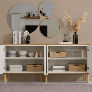 This elegant buffet combines crisp white with warm wood accents, adding a touch of modern luxury to your dining room or living room. It offers ample space for storing and organizing items neatly, while durable materials ensure long-lasting use and a consistently stylish appearance . Available upon request.