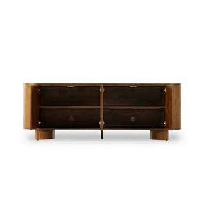 This modern 180 x 45 cm buffet in a warm brown hue blends contemporary design with classic mid-20th-century touches. Its flowing lines and rounded corners give it an elegant and sophisticated look. The buffet features two doors, each with a practical internal shelf, providing organized storage for cutlery or serving essentials in a neat and attractive manner. Crafted from natural wood and high-quality veneer for durability and longevity, the brown color adds a touch of warmth and appeal, complementing any interior décor with a harmonious and luxurious style. Its balanced and streamlined design makes it a centerpiece that brings character and life to your dining room or living room.