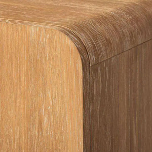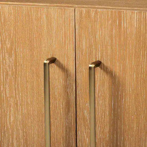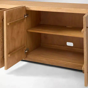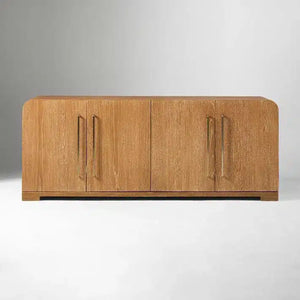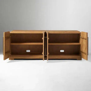 This modern 180 x 45 cm buffet, in a warm wood tone, combines luxury with contemporary simplicity. Its design focuses on smooth horizontal lines and subtle brass accents, adding a touch of refined elegance to any room. The buffet features concealed storage within the doors and practical open drawers, seamlessly blending beauty and functionality. Small horizontal handles in gold or brass add a stylish contrast, while sturdy, thick legs provide a stable and modern base. Crafted from natural wood and high-quality veneer for durability and longevity, it's the perfect addition to any dining room or living room.